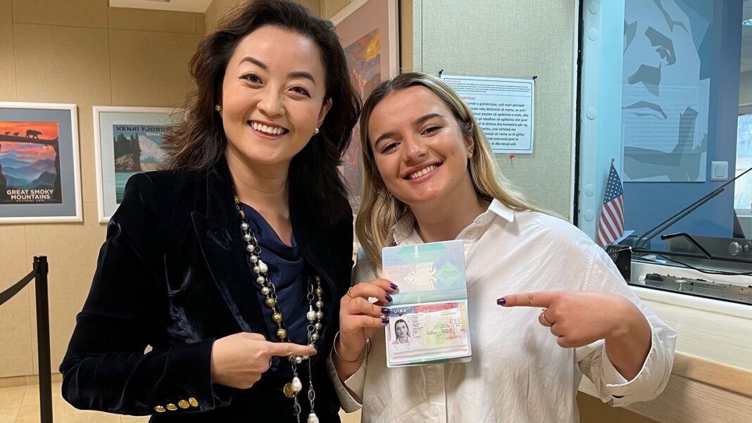 Mëngjesin e sotëm, Ambasadorja Yuri Kim përshëndeti aplikanten shqiptare të cilës iu dha viza e parë amerikane e vlefshme për 10 vjet. Ambasadorja Kim e uroi atë dhe bisedoi mbi planet e udhëtimit të saj për në Shtetet e Bashkuara këtë verë.