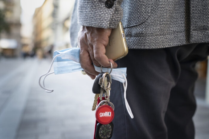 Ein Mann haelt seinen Schlusselbund, sein Smartphone und eine Hygienemaske in der Hand, fotografiert am 17. Oktober 2020 in Lugano. (KEYSTONE/Gaetan Bally)