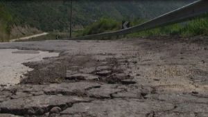 Asfalti është hequr nga punonjësit e mirëmbajtjes së rrugës dhe është hedhur në anë të saj. Pamjet tregojë se shumë pjesë të kësaj rruge janë çarë, duke u bërë kështu rrezik për aksidente.
