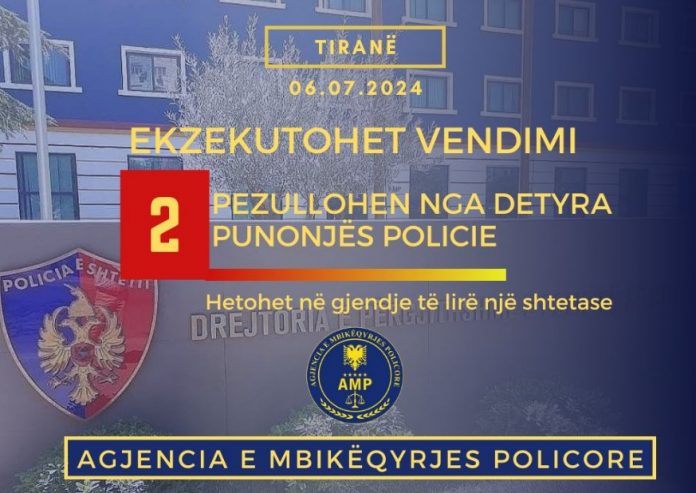 Agjencia e Mbikëqyrjes Policore njoftoi sot se ka pezulluar nga detyra dy punonjës të policisë rrugore. Shkak është një hetim i nisur ndaj tyre për veprën penale të “Shpërdorimit të Detyrës”.