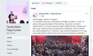Balla akuzon Bashën në statusin e tij se, me Dritan Shorajn në krah mbajti bllokuar vettingun për disa muaj në “çadrën e lirisë” të ngritur në sheshin para Kryeministrisë, për të hedhur themelet e “Republikës së Re”, madje sulmoi edhe partnerët e Shqipërisë.
