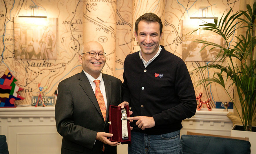 Ndërkohë, kryetari i Bashkisë së Tiranës, Erion Veliaj i dhuroi simbolin e “Kullës së sahatit” për kontributin e tij në avancimin e marrëdhënieve dypalëshe Shqipëri-SHBA.