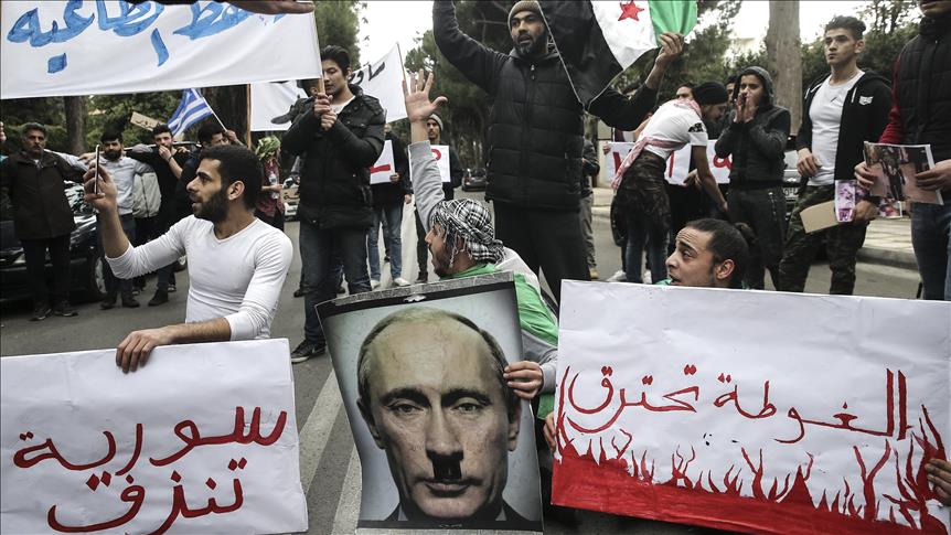 Protestuesit brohoritën me slogane “Putini i poshtër”, ndërsa mbanin pankarta me mbishkrim “Shpëtoni Gutën”. Gjithashtu një deklaratë ku dënohen sulmet e regjimit të Asadit dhe Rusisë i është përcjell ambasadës.