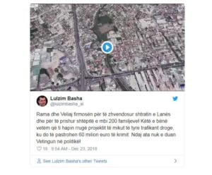 Sipas asaj që shkruan ai, e që e shoqëron edhe me një video ilustruese, firmat e tyre janë hedhur për të zhvendosur shtratin e lumit të Lanës, që sjell si pasojë edhe prishjen e shtëpive të mbi 200 familjeve.