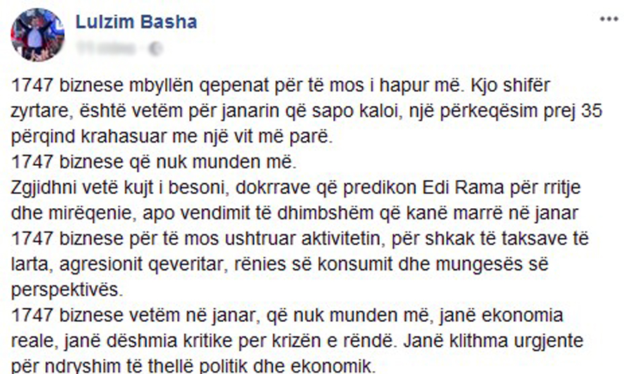 Kreu i Partisë Demokratike, Lulzim Basha, me anë të një postimi në Facebook deklaroi se “1747 biznese mbyllën qepenat për të mos i hapur më”.