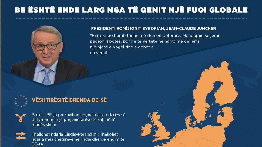 Deklarata e Junckerit, i cili në një intervistë për një gazetë holandeze ka thënë e “Europa po humb fuqinë në skenën botërore. Mendojmë se jemi padroni i botës, por në të vërtetë ne harrojmë që ne jemi një pjesë e vogël dhe e dobët e universit”.