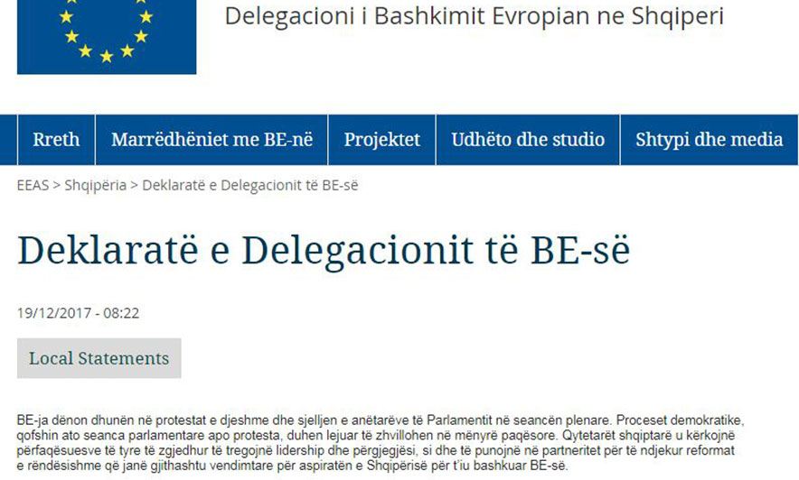 “BE-ja dënon dhunën në protestat e djeshme dhe sjelljen e anëtarëve të Parlamentit në seancën plenare. Proceset demokratike, qofshin ato seanca parlamentare apo protesta, duhen lejuar të zhvillohen në mënyrë paqësore. Qytetarët shqiptarë u kërkojnë përfaqësuesve të tyre të zgjedhur të tregojnë lidership dhe përgjegjësi, si dhe të punojnë në partneritet për të ndjekur reformat e rëndësishme, që janë gjithashtu vendimtare për aspiratën e Shqipërisë për t’iu bashkuar BE-së”, thuhet në reagimin e delegacionit të BE-së.