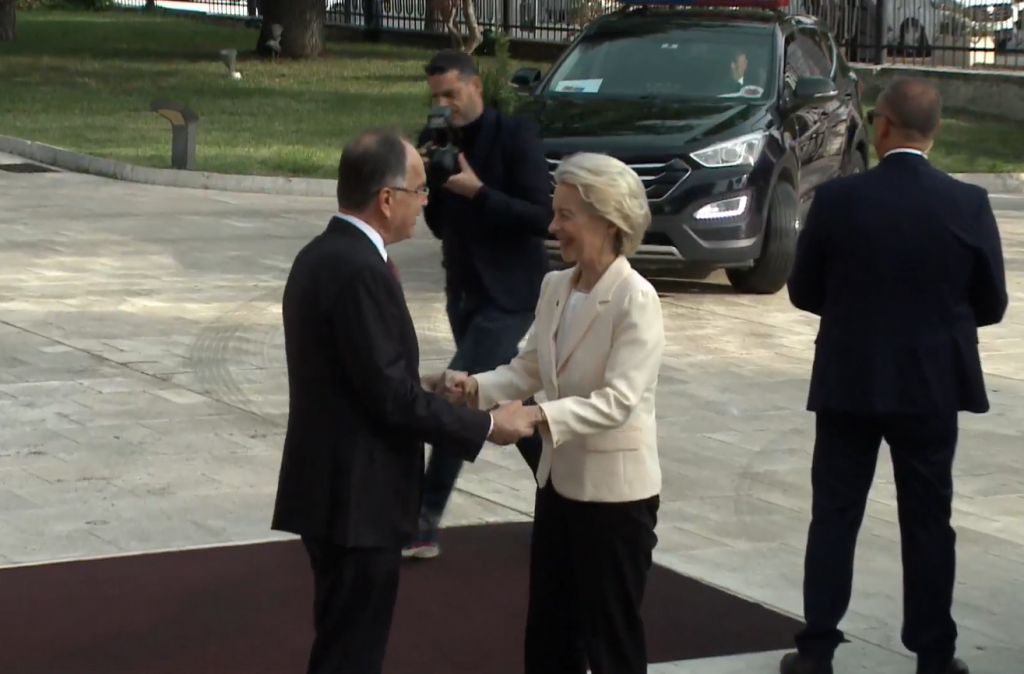 Gjatë pritjes, Presidenti Begaj i uroi presidentes Von der Leyen mirëseardhjen në Tiranë, ndërkohë që në vijim po zhvillojmë edhe takimin me dyer të mbyllura.