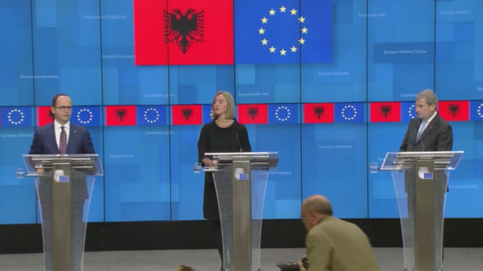 Në Bruksel është mbajtur një konferencë e përbashkët për mediat nga ministri i Jashtëm Ditmir Bushati, eurokomisioneri për zgjerimin Johannes Hahn dhe përfaqësuesja për Politikë të Jashtme në BE, Federica Mogherini.