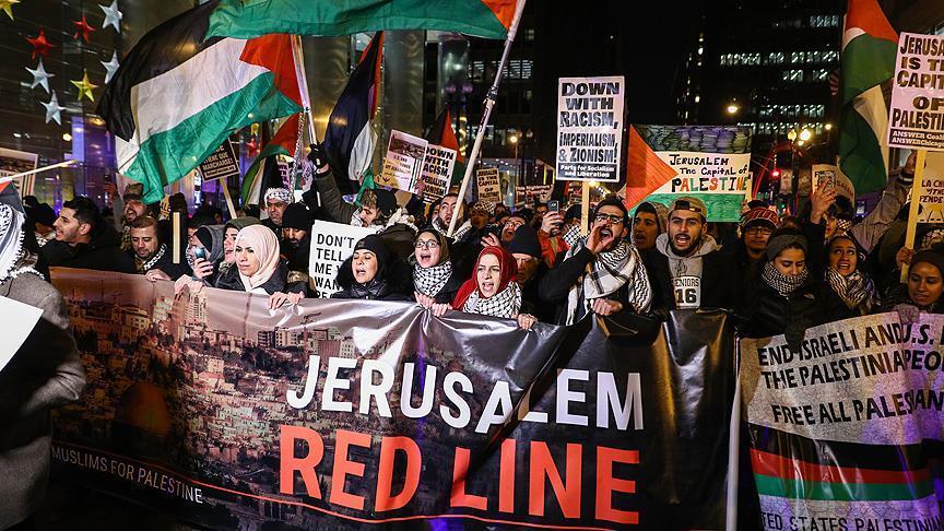 Disa mijëra protestues u mblodhën mbrëmë në rrugët e Chicagos në SHBA për të protestuar kundër vendimit të presidentit amerikan Donald Trump për njohjen e Jerusalemit si kryeqytet të Izraelit. ( Bilgin S. Şaşmaz – Anadolu Agency )