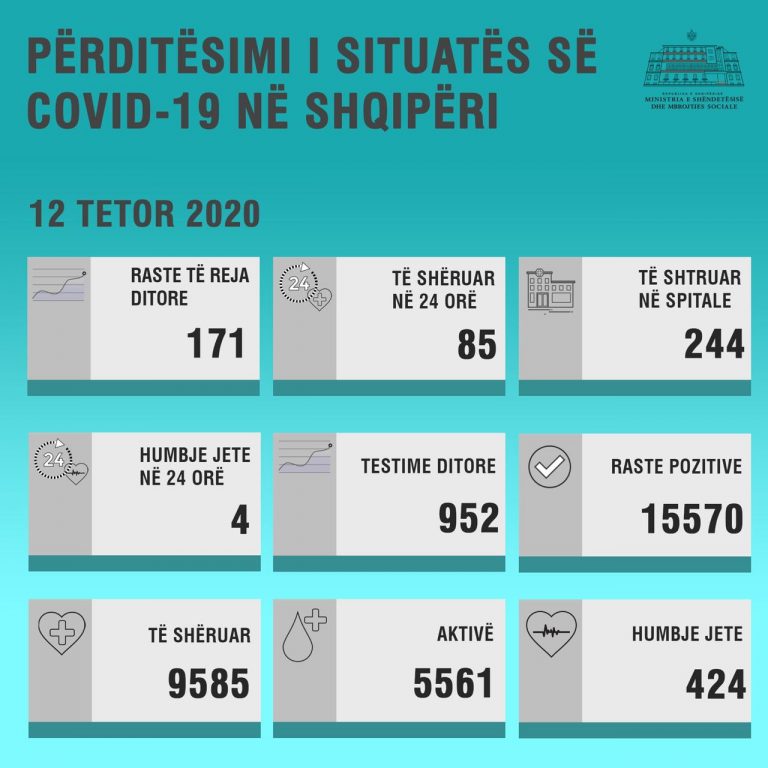 Ju informojmë lidhur me situatën epidemiologjike në 24 orët e fundit të COVID19 në Shqipëri: Janë kryer 952 testime në 24 orët e fundit, nga të cilët kanë rezultuar pozitivë 171 qytetarë të prekur nga virusi SARS-COV2.