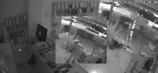 Pasi hap derën kryesore prej xhami me sqepar duke e lëshuar të gjithën në tokë, ai futet në dyqan mbledh me shpejtësi 13 celularë të vendosur në vitrinë, i fut në xhepa dhe largohet me vrap.