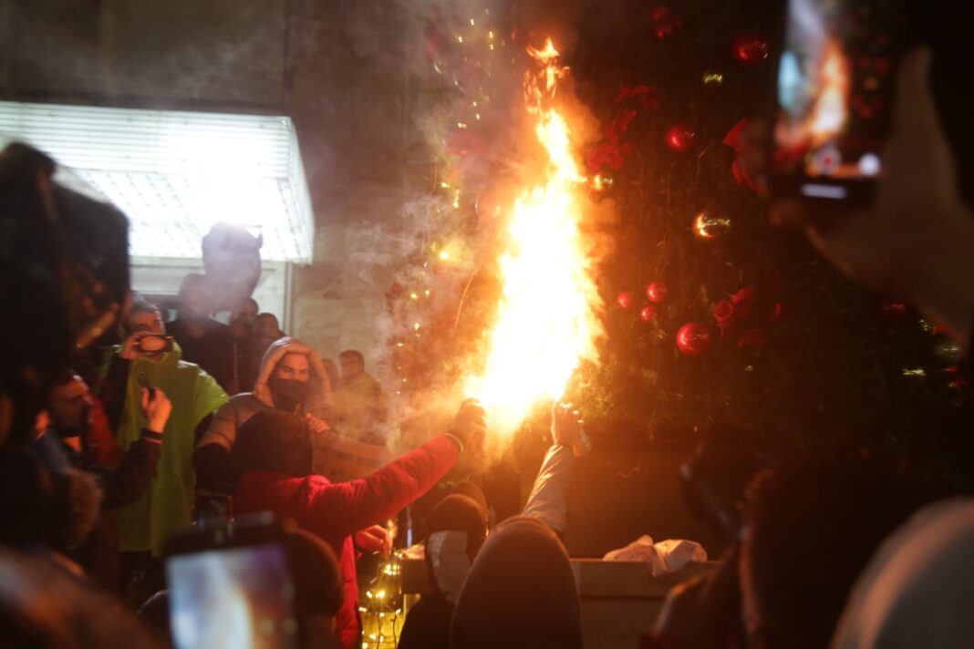 “Nga specialistët për Hetimin e Krimit në Komisariatin e Policisë Nr. 1 u bë kapja dhe ndalimi i shtetasit O. Xh., 22 vjeç, pasi më datë 09.12.2020, gjatë protestës së zhvilluar në bulevardin “Dëshmorët e Kombit” i ka vënë flakën pemës së Krishtlindjeve.