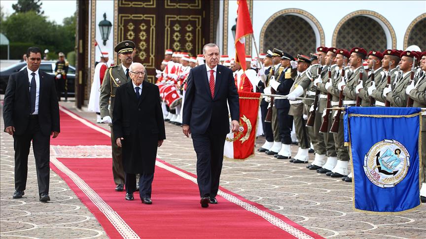 Pas intonimit të himneve të të dy vendeve në Pallatin Presidencial të Tunizisë dhe prezantimit të delegacioneve, Erdoğan dhe Sibsi pozuan para gazetarëve, kurse më pas kaluan në takimin kokë më kokë dhe atë mes delegacioneve.