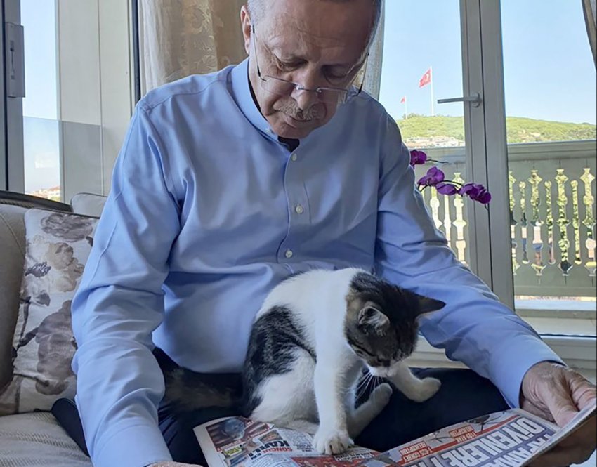 Macja qëndron e ulur në prehrin e Erdoganit ndërsa ai lexonte gazetën.