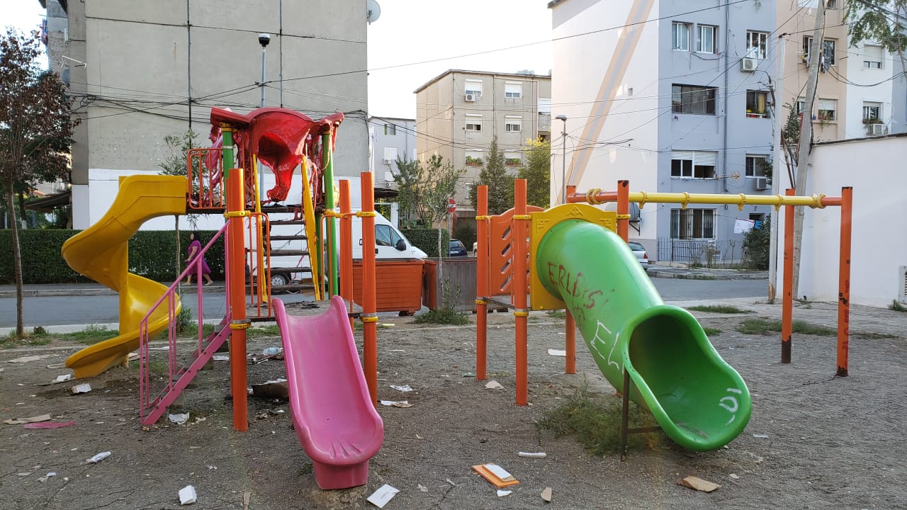 Sikurse mund të shihni edhe nga kjo foto, zjarrvënia ka qenë e qëllimshme, pasi  dëmet janë vërtet të mëdha. Madje, nuk mungojnë edhe plehrat e hedhura qëllimisht. Që me ardhjen në krye të Bashkisë së Tiranës,  Erion Veliaj nisi një fushatë të ndërtimit të këndeve të lojërave dhe kënde sportive në çdo lagje.