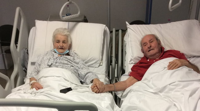 Dorën për dore edhe në një shtrat spitali. Kjo është fotoja e një çifti në Itali në cilët mundën virusin e tmerrshëm Covid-19. Fotoja e Ivo Landi dhe Livia Arrighini, 93 dhe 88 vjeç të shkaktuar në repartin covid u publikua nga djali i tyre.