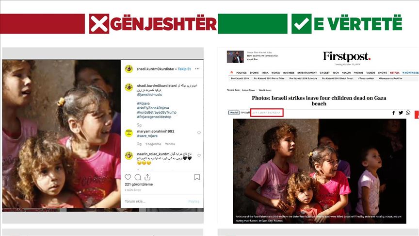 Një nga llogaritë pro organizatës terroriste YPG/PKK postoi një fotografi të fëmijëve gjoja duke qarë gjatë operacionit “Burimi i Paqes”. Në fakt, fotografia është shkrepur në Gaza gjatë sulmeve të Izraelit në vitin 2014.