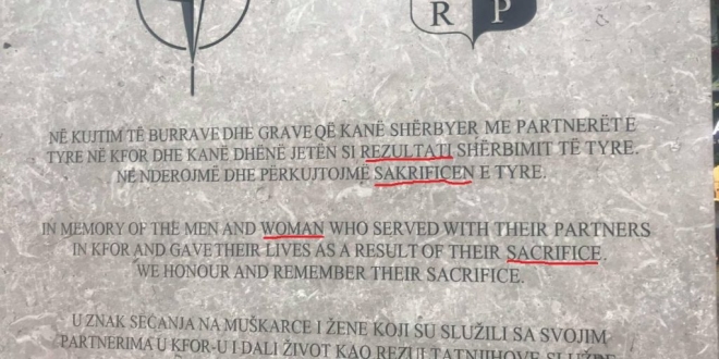 Monumenti i zbuluar sot në qendër të Prishtinës në kujtim të 157 ushtarëve të KFOR-it, të cilët kanë rënë gjatë shërbimit të tyre në Kosovë, përmban disa gabime drejtshkrimore.