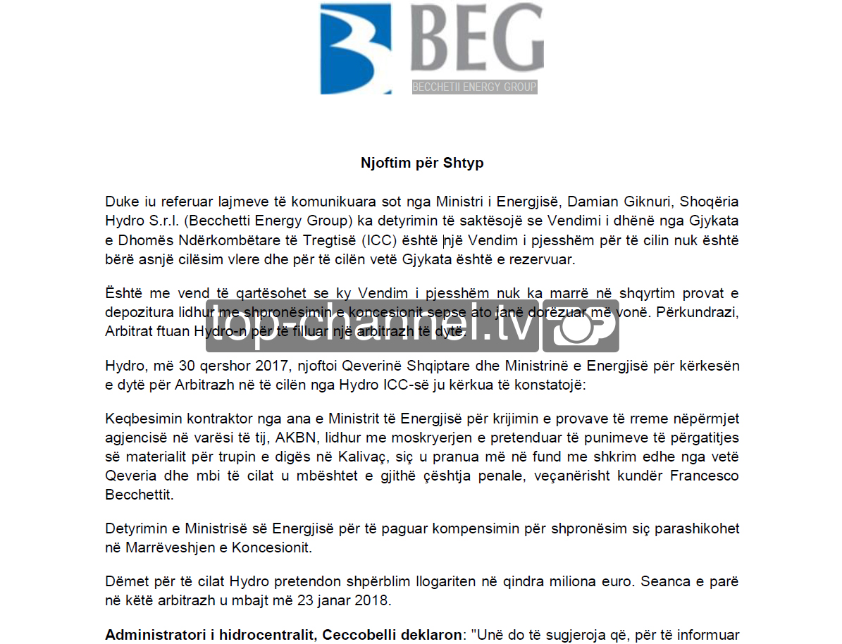 Dëmet për të cilat Hydro pretendon shpërblim llogariten në qindra miliona euro. Seanca e parë në këtë arbitrazh u mbajt më 23 janar 2018. Për Top Channel reagoi edhe administratori i hidrocentralit, Ceccobelli i cili deklaron se do të sugjeronte që, për të informuar publikun shqiptar në mënyrë transparente, Ministri Gjiknuri duhet të presë derisa të shpallet vendimi përfundimtar i Arbitrazhit dhe rezultatet e shumë çështjeve tjera që janë në zhvillim./Top Channel/