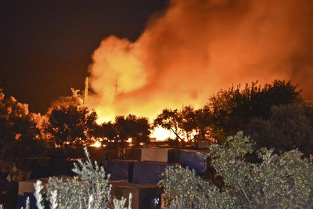 A fire burns behind makeshift tents used by asylum-seekers in Samos Island Greece, late Monday, Oct. 14, 2019. Greek authorities are evacuating the camp where the large fire broke out following clashes between residents. (ANSA/AP Photo/Michael Svarnias) [CopyrightNotice: Copyright 2016 The Associated Press. All rights reserved.]