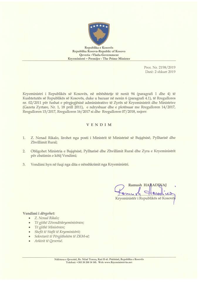 Kryeministri i Kosovës Ramush Haradinaj, ka marrë vendim që ta lirojë nga pozita e Ministrit të Bujqësisë, Pylltarisë dhe Zhvillimit Rural, Nenad Rikalon.