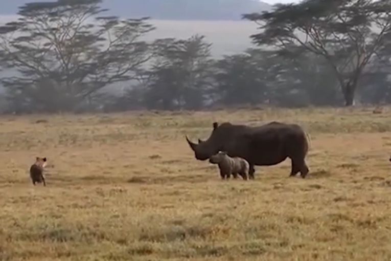 Aty, dy hiena tentojnë të gjuajnë një baby-rinoceront, por e ëma është rojtarja e paepur e të voglit.