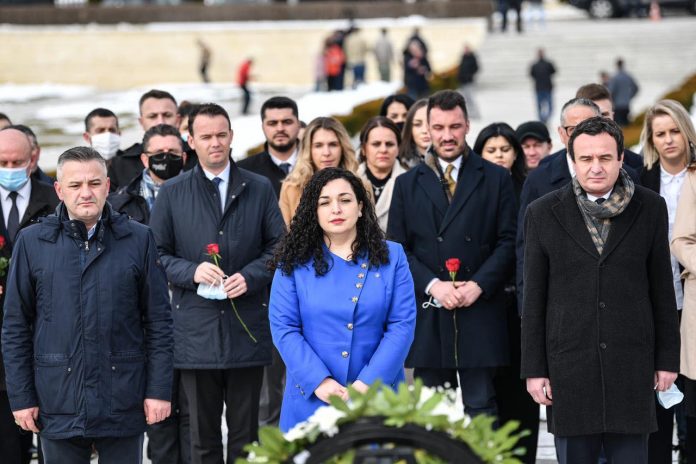 Edhe u.d e presidentes, Vjosa Osmani e shoqëruar nga lideri i LVV-së, Albin Kurti kanë vendosur kurora lulesh në varrezat e familjes Jashari.
