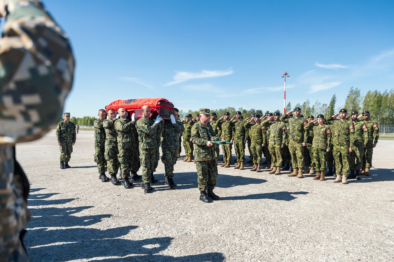 Trupi i nën tetares në arkmortin e mbuluar me flamurin kuq e zi u përcoll me ceremoni të rastit nga Riga, për në Shqipëri. Në bazën Camp Adazi në Letoni paraditen e sotme u organizua ceremonia e lamtumirës me pjesëmarrjen e efektivëve nga 10 vendet, pjesë e misionit “Enhanced Forward Presence”.