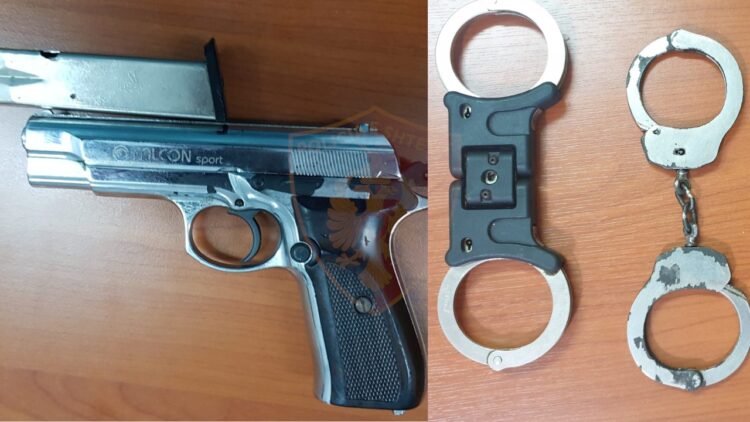 Gjatë kontrollit fizik ndaj këtij shtetasi, në çantën e tij të dorës, shërbimet e Policisë kanë gjetur një armë zjarri pistoletë. Gjithashtu, gjatë kontrollit në banesën e tij u gjetën 2 palë pranga hekuri si ato të Policisë, të cilat u sekuestruan në cilësinë e provës materiale.