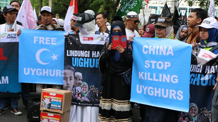 Qindra persona u mblodhën për të protestuar para Ambasadës së Kinës në kryeqytetin e Indonezisë, Xhakartë, kundër praktikave ndaj komunitetit Ujgur nga ana e autoriteteve kineze.