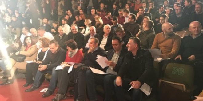Kur Hyseni thirri emrin e Albin Kurtit, i cili mungon në mbledhje për shkak se gjendet në paraburgim, të pranishmit në sallë nuk i ndalën duartrokitjet për një kohë të gjatë./Kosova Post/