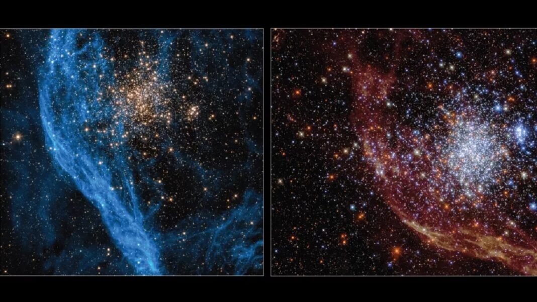 Në të dy imazhet ndriçojnë yje të ndryshme. Më të rinjtë janë në blu të ndezur që duken në foton me ngjyrim të kuq. Sipas NASA-s, “ata ndriçojnë dhe digjen më shumë” krahasuar me yjet e kuq.