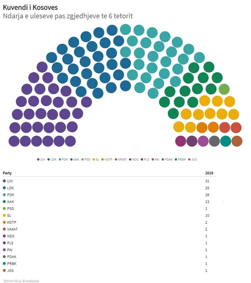 Vela po ashtu, ka publikuar një skemë se si do të duken shpërndarja e ulëseve në Kuvendin e Kosovës pas zgjedhjeve te 6 tetorit 2019.
