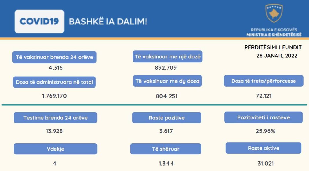 Ministria e Shëndetësisë së Kosovës ka raportuar katër vdekje si dhe 3,617 raste të reja të infektimit me COVID-19.