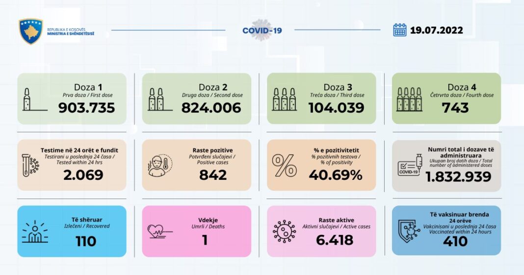 Ministria e Shëndetësisë ka bërë të ditur se nga 2,069 testime të kryera nga IKSHPK gjatë 24 orëve të fundit 842 persona kanë rezultuar pozitivë, me coronavirus.