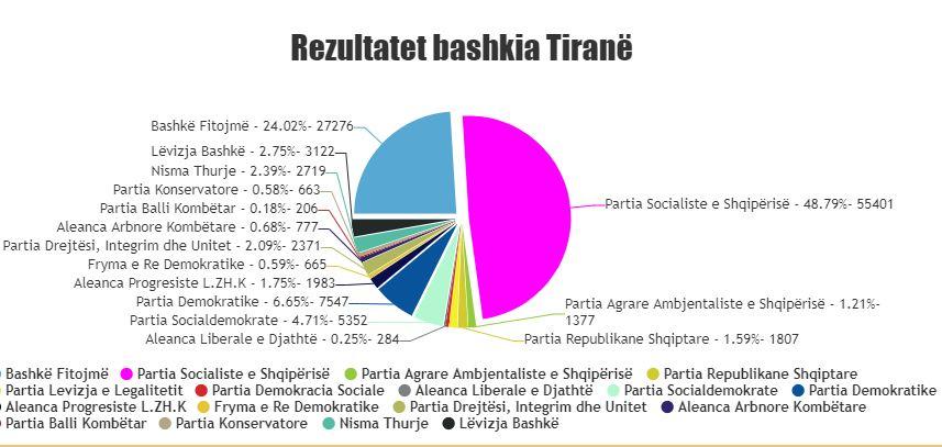 Po vijon numërimi i votava për Këshillin Bashkiak të Tiranës. Teksa janë numëruar 376 qendra votimi nga 941 në total, kryeson Partia Socialiste me 48.79% të votave, ose 55401 vota.