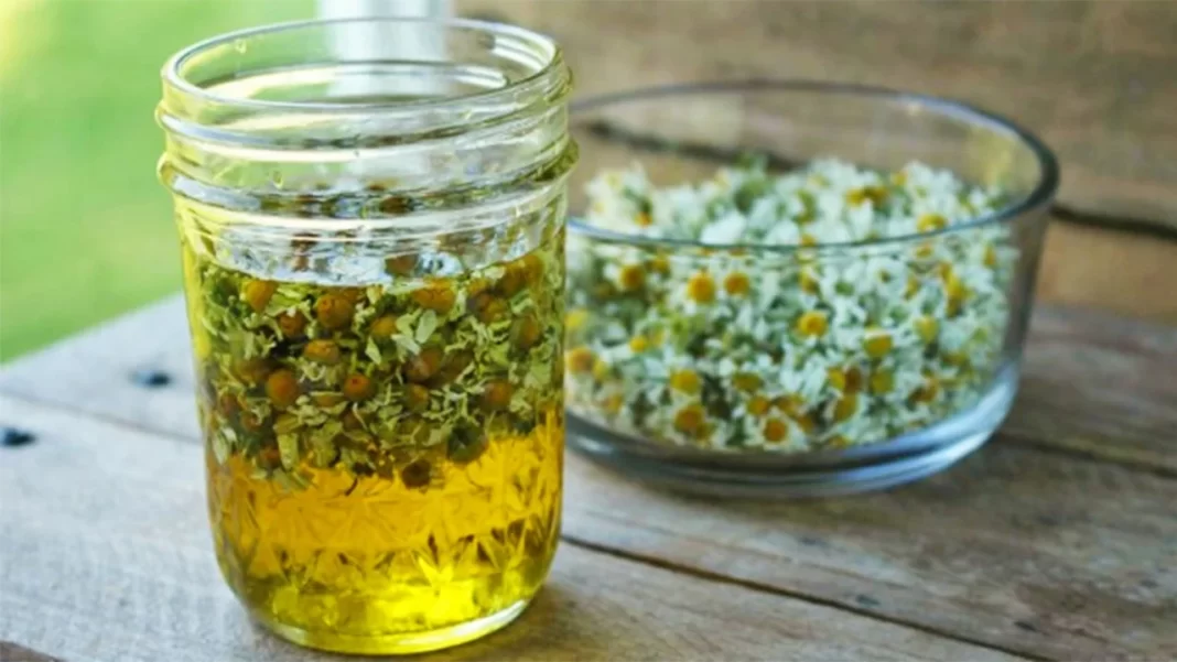 Në një kavanoz të madh qelqi, hedhim gjysëm litër vaj ulliri ekstra të virgjër, më pas shtojmë rreth 3-4 lugë të plota gjelle me lule kamomili. Me ndihmën e një luge të përzieni përbërjen, në mënyrë që lulet të jenë të zhytura plotësisht në vaj.