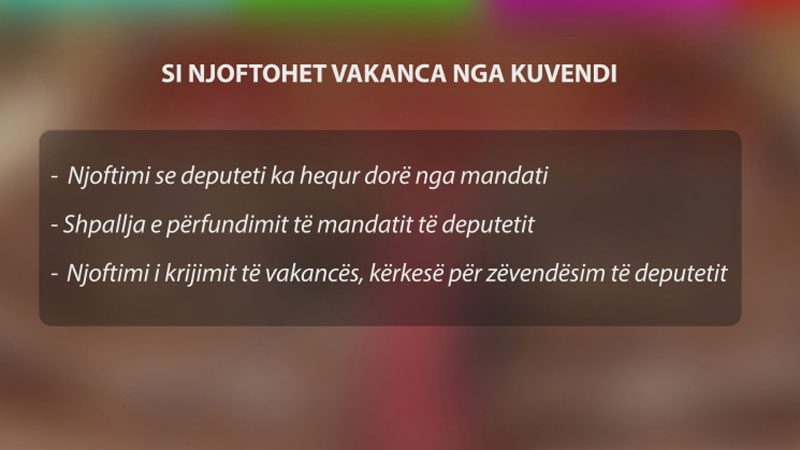 Neni 164 Pika 1 e Kodit Zgjedhor nënvizon shprehimisht se është pikërisht Kuvendi që duhet të njoftojë KQZ-në për krijimin e vakancës. Në mungesë të këtij akti, mbetet për t’u parë nëse KQZ do të rikthejë përsëri topin në zyrat e Kuvendit, gjë që do të vonojë në kohë zëvendësimin e deputetëve të dorëhequr.