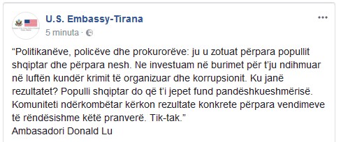 “Ne investuam në burimet për t’ju ndihmuar. Ku janë rezultatet?”, pyet Lu në mesazhin e postuar në faqen në Facebook të Ambasadës Amerikane. Ai thekson se Populli shqiptar do që t’i jepet fund pandëshkueshmërisë.