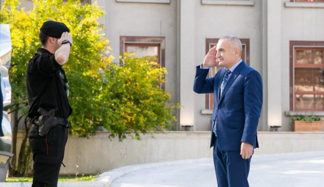 Ndërkohë pak para se të dilte në prononcim për mediat, teksa pritej me interes të madh nga gazetarët, Meta përshëndeti në mënyrë ushtarake gardistin e presidencës.