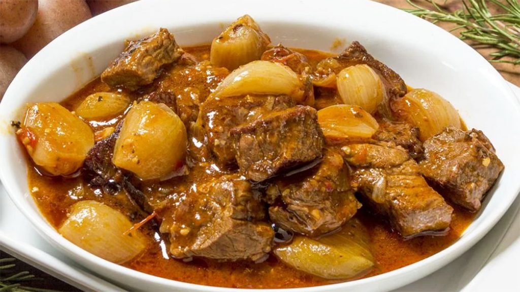 Lëreni të ziejë në zjarr të ngadaltë derisa mishi të zbutet dhe gjella të mbetet jo me shumë lëng.