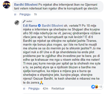 Një qytetar i ka komentuar Ramës se në një kohë kur ai prenzaton punën e qeverisë me shëndetësinë përgjatë 2019, infermierët kanë ikur në Gjermani. Ndërsa tani në Shqipëri kanë ngelur vetëm ndërtesat dhe të korruptuarit. “Po mjeket dhe infermjeret iken ne Gjermani tani vetem ndertesat kan ngelur dhe te korruptuarit qe slevizin”, shkruan qytetari.