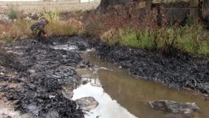 Kjo është zona ku kompanitë që nxjerrin naftë shkarkojnë mbetjen, direkt në Lumin Gjanica. Edhe pse ka patur reshje shiu që kanë tërhequr naftën e derdhur së fundmi, këtu duken qartë pasojat e ndotjes. Ende pemët dhe shkurret janë lyer me naftën bruto. Toka është ndotur aq shumë, sa këtë e tregon edhe një eksperiment i thjeshtë.