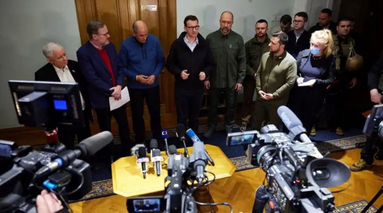 Udhëheqësit e tri vendeve të Evropës Qendrore e kanë lavdëruar Ukrainën për “luftën e saj të guximshme” kundër forcave pushtuese ruse, pasi përfunduan një udhëtim në Kiev në shenjë solidariteti me qytetin e rrethuar dhe presidentin e Ukrainës, Volodymyr Zelensky. Vaclav Smolka, zëdhënës i kryeministrit çek, Petr Fiala, postoi në Twitter një foto të kryeministrit çek më 16 mars, me një jelek mbrojtës dhe me helmetë.