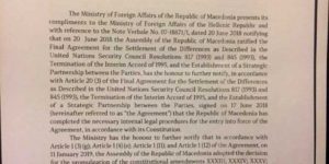 Nota verbale të cilën MPJ e Maqedonisë e dërgoi në Athinë