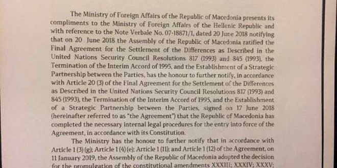 Në fillim të Notës verbale, Ministria e Punëve të Jashtme të Republikës së Maqedonisë e njofton Ministrinë e Punëve të Jashtme të Greqisë se më 20 qershor Marrëveshja e Prespës ishte ratifikuar në kuvend, ndërsa më 11 janar të vitit 2019 se “në bazë të Nenit 1 (3) (e), Neni 1 (4) (d). Neni 1 (11) dhe Neni 1 (12) të Marrëveshjes, Kuvendi i Republikës së Maqedonisë e miratoi Vendimin për shpalljen e amendamenteve XXXIII, XXXIV, XXXV, XXXVI të Kushtetutës së Republikës së Maqedonisë dhe Vendimin për shpalljen e ligjit kushtetues për zbatimin e amendamenteve nga XXXIII deri në amendamentin XXXVI të Kushtetutës së Republikës së Maqedonisë.