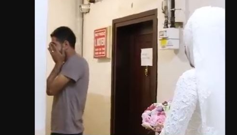 Në këtë skenë të mahnitshme, dhëndri qëndron i kthyer me shpinë teksa pret surprizën e gruas së tij të ardhshme.