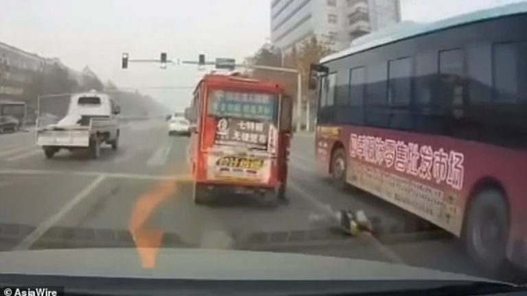 Furgoni brenda të cilit gjendej fëmija, po bëhej gati të nisej para semaforit dhe papritur në mënyrë të befasishme hapet dera dhe fëmija bie në një rrugë në qytetin kinez Baoding në provincën Hebei. Fati i mirë i foshnjës bëri që të mos përfundojë poshtë rrotave të autobusit, ndërkohë nëna kur e kuptoi se çfarë ndodhi, kërceu edhe ajo në asfalt për ta shpëtuar fëmijën e saj.