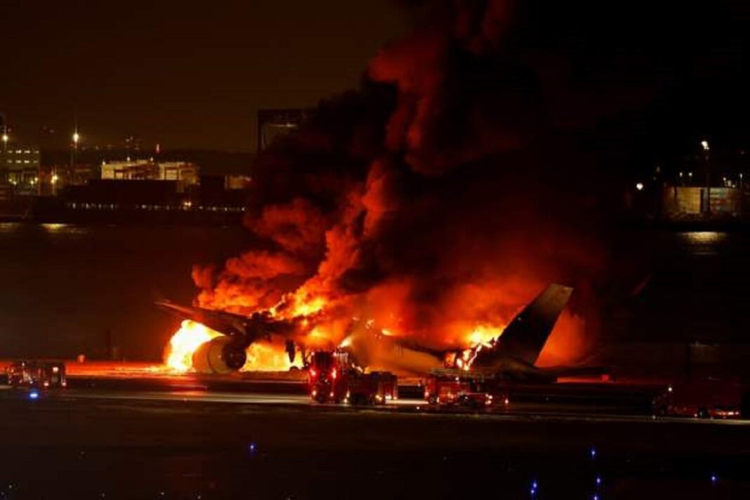 Momente tmerri kanë përjetuar pasagjerët e aeroplanit të “Japan Airlines” që u përfshi në ajër nga flakët e zjarrit teksa po përgatitej për ulje në aeroportin Heneda të Tokios në Japoni.
